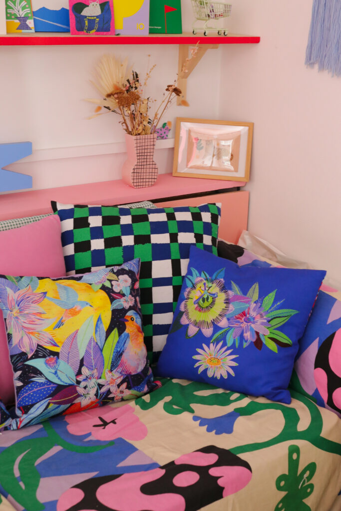 Les coussins que j’ai également réalisés avec la maison d’édition textile AmesSoeurs sont parfaits pour réveiller un intérieur. Ils fonctionnent aussi bien dans un espace très sobre où ils apportent une touche pop et colorée que dans un univers déjà très vibrant, où ils se fondent naturellement.