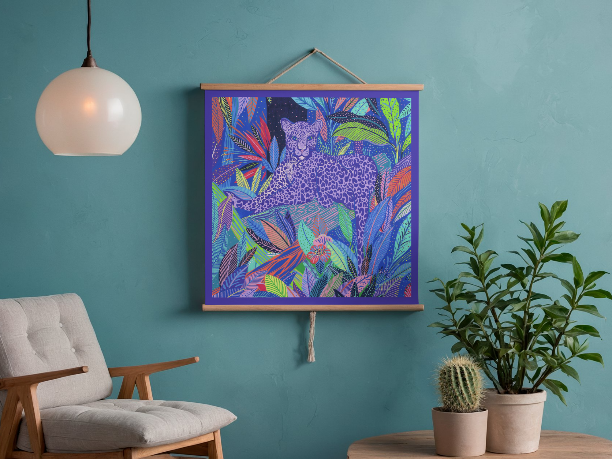 Avec une paire de baguettes pour affiche, il suffit de glisser le tissu entre les deux parties pour le tendre délicatement. Le foulard se transforme alors en illustration murale : léger, coloré et vivant.