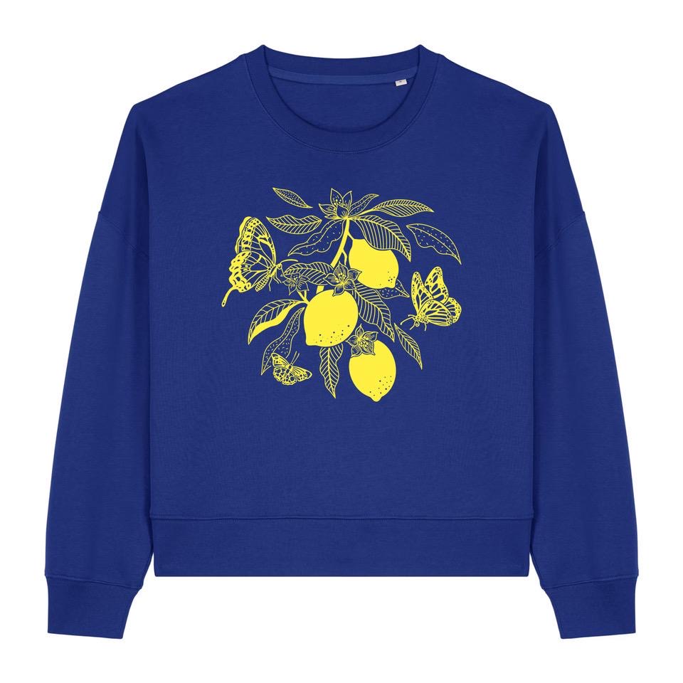 Sweat bleu électrique – Citrons et papillons